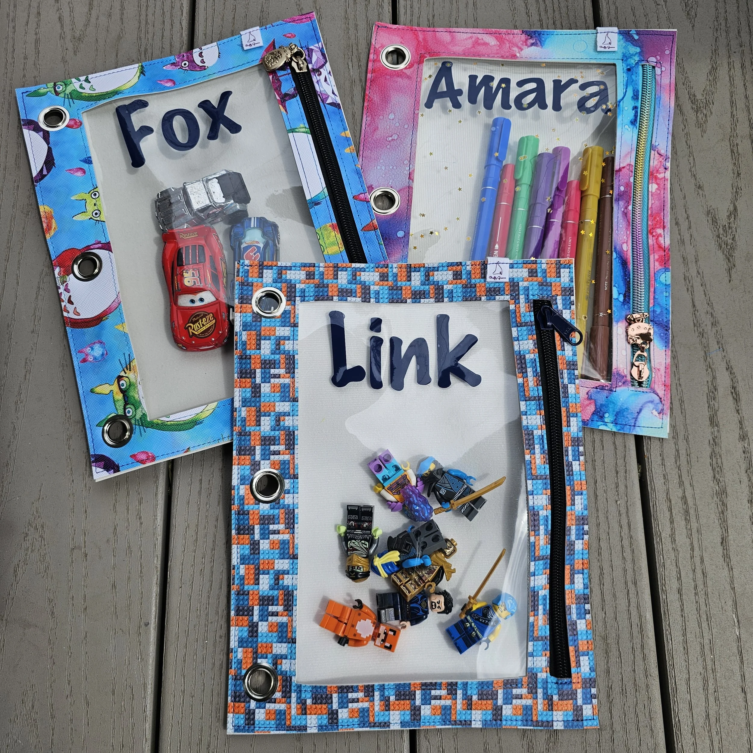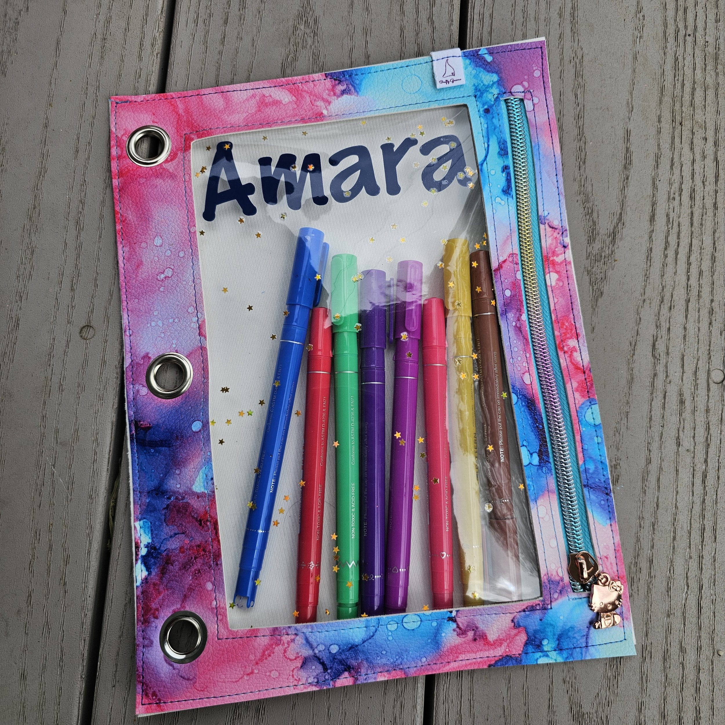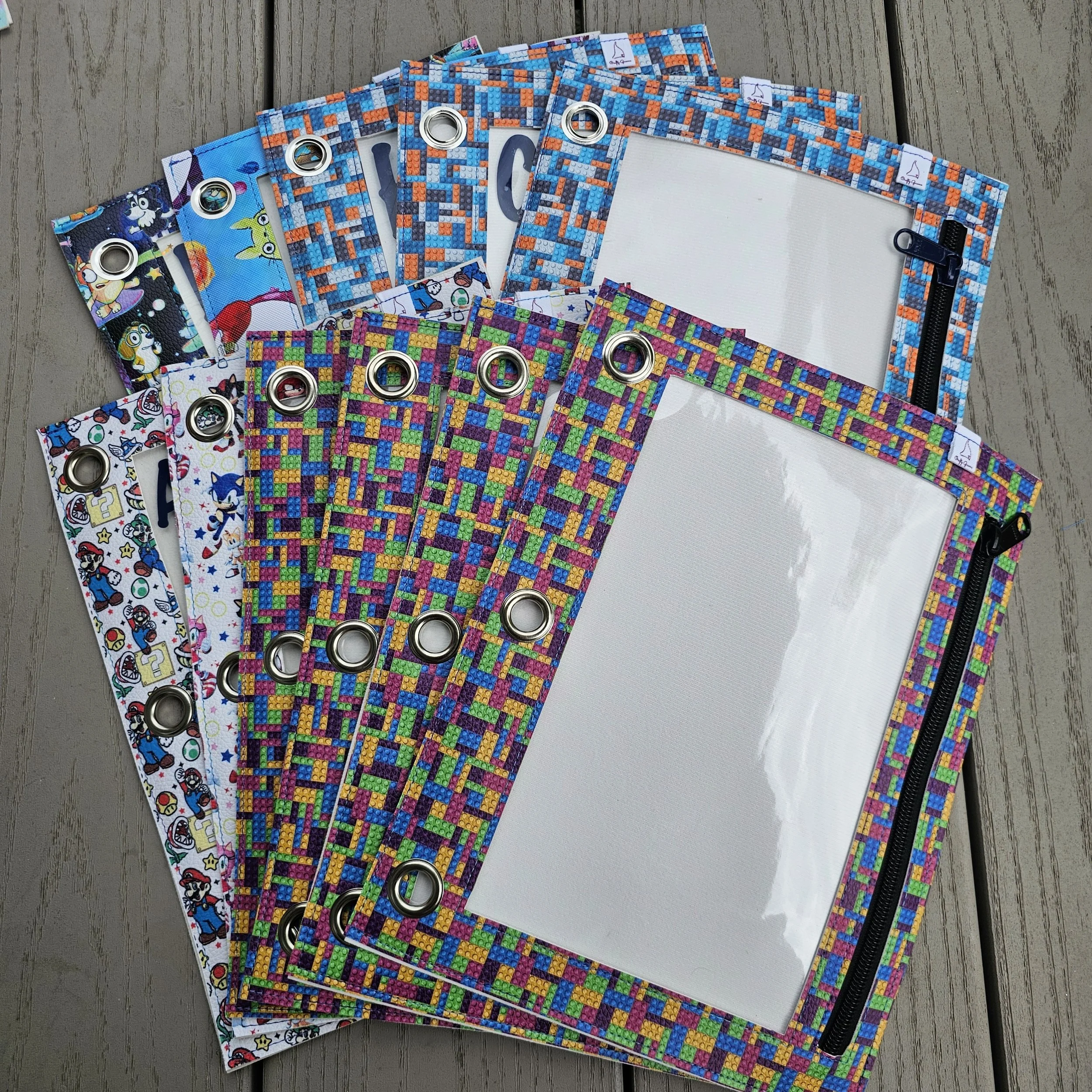 One large pocket that can hold pens, pencils and accessories. Holes are reinforced for durability, and set to fit inside a standard 3-ring binder. Measures approximately 8” x 10.5”. These are made from faux leather/vinyl and clear vinyl for the window.