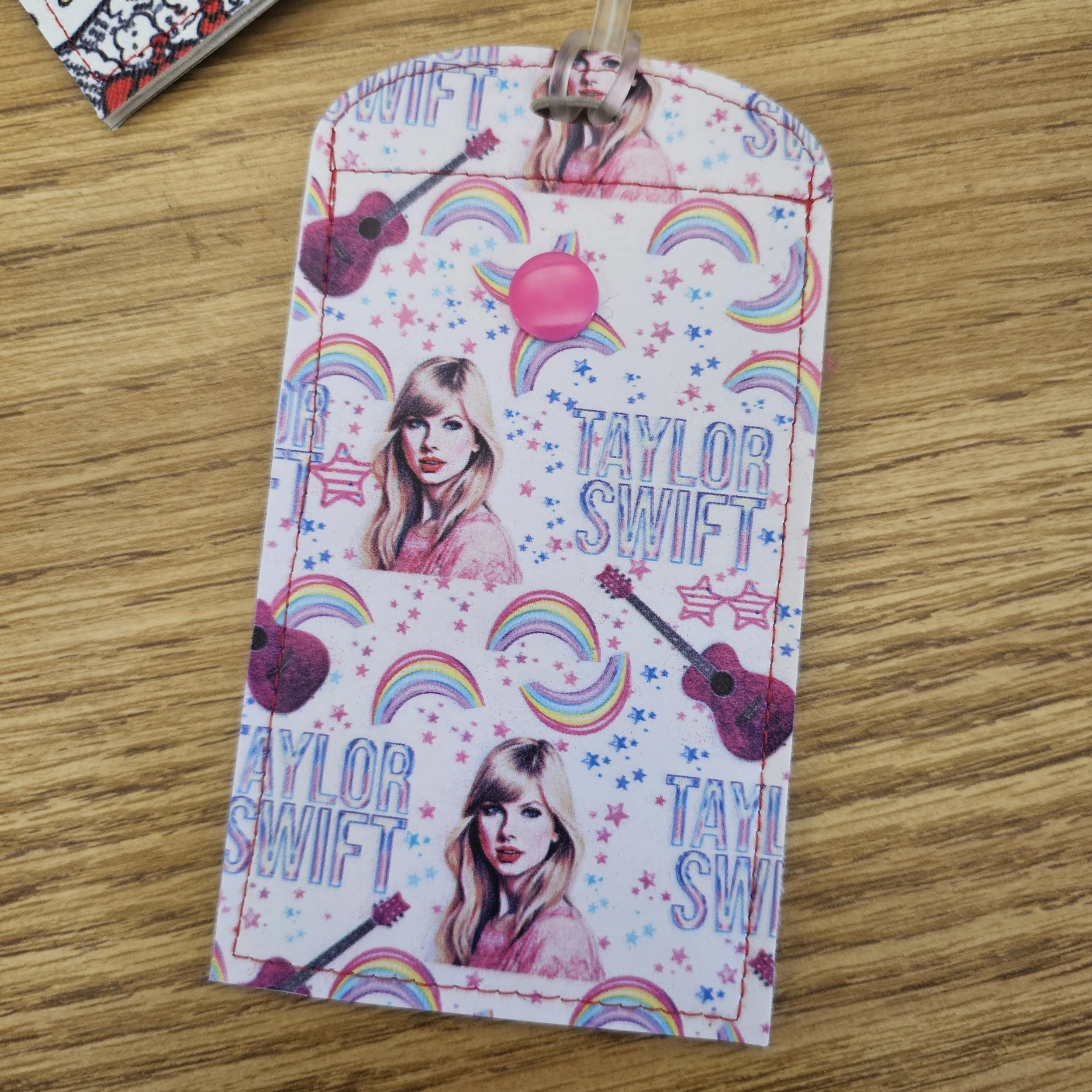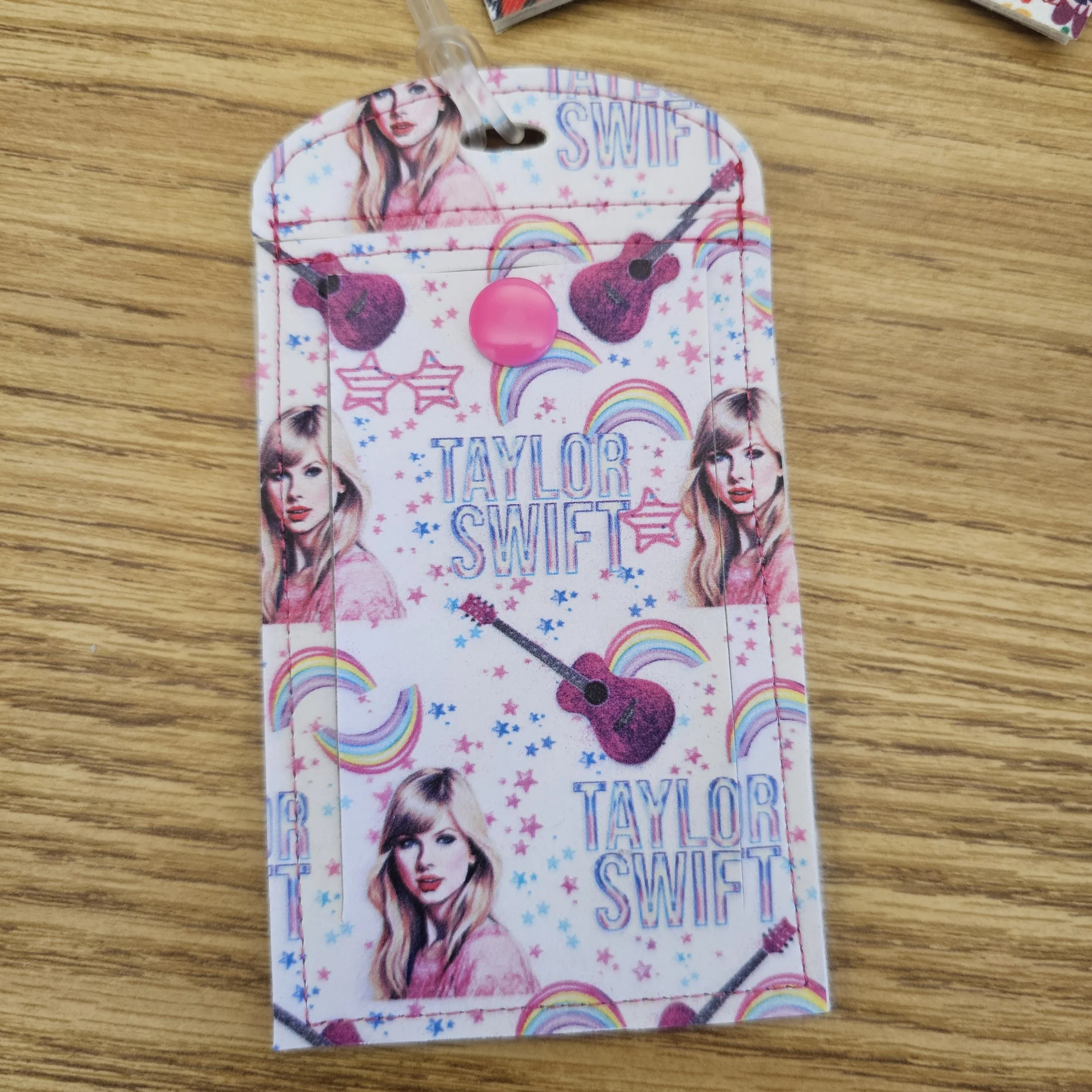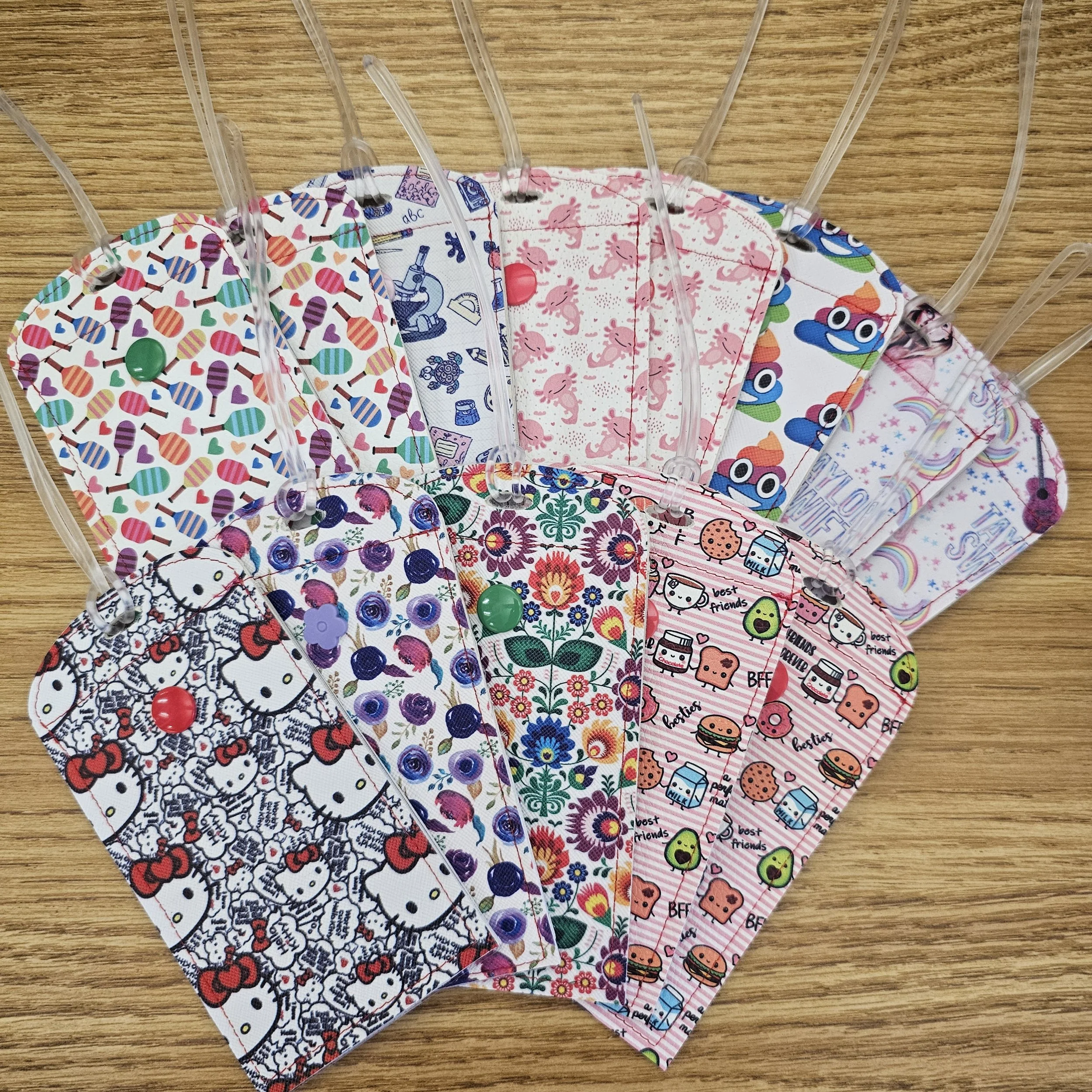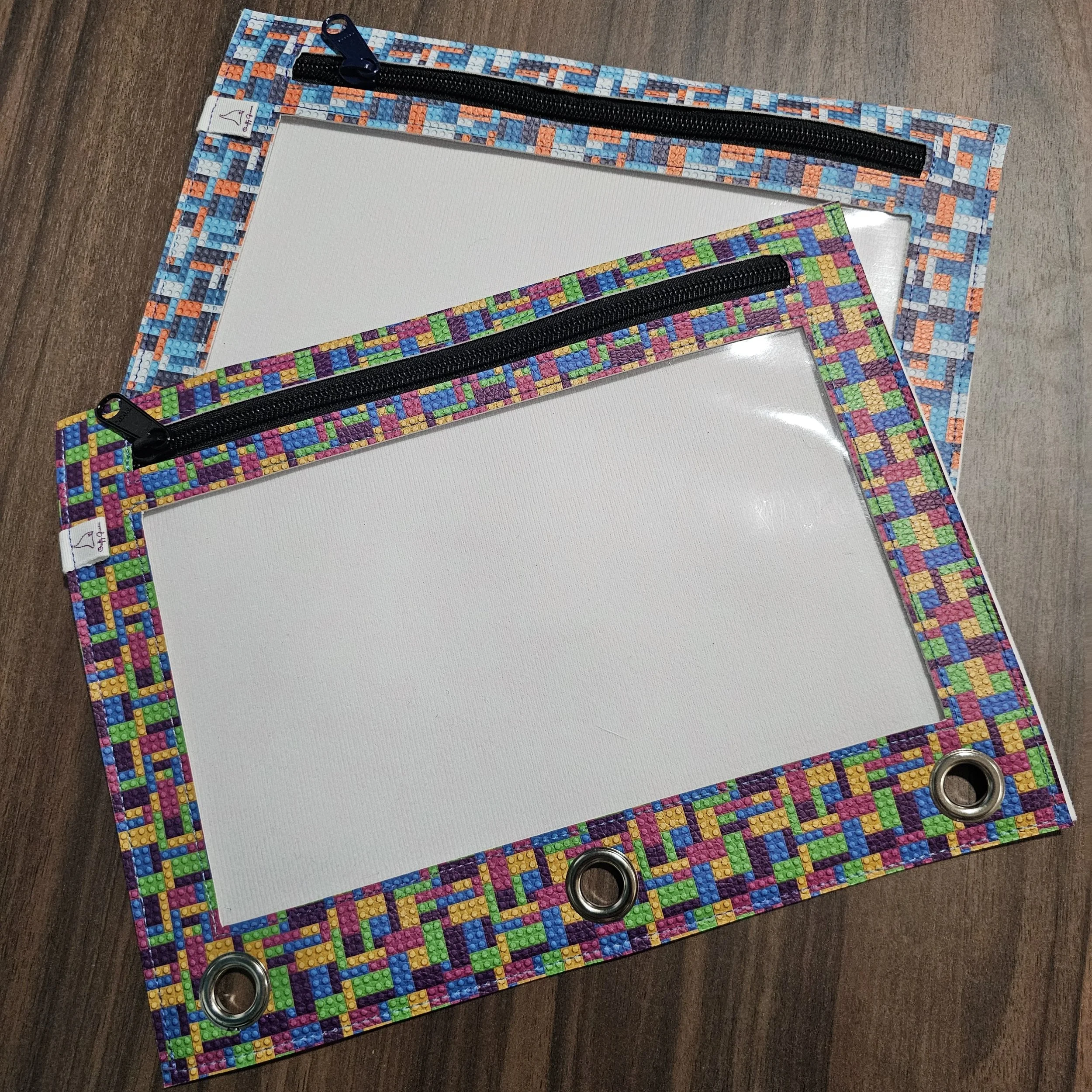 One large pocket that can hold pens, pencils and accessories. Holes are reinforced for durability, and set to fit inside a standard 3-ring binder. Measures approximately 8” x 10.5”. These are made from faux leather/vinyl and clear vinyl for the window.