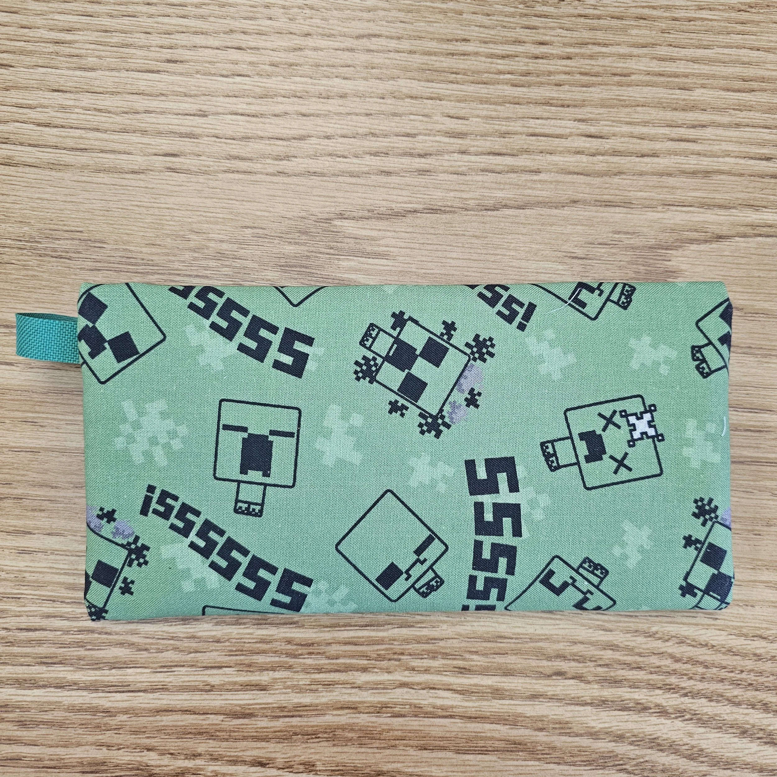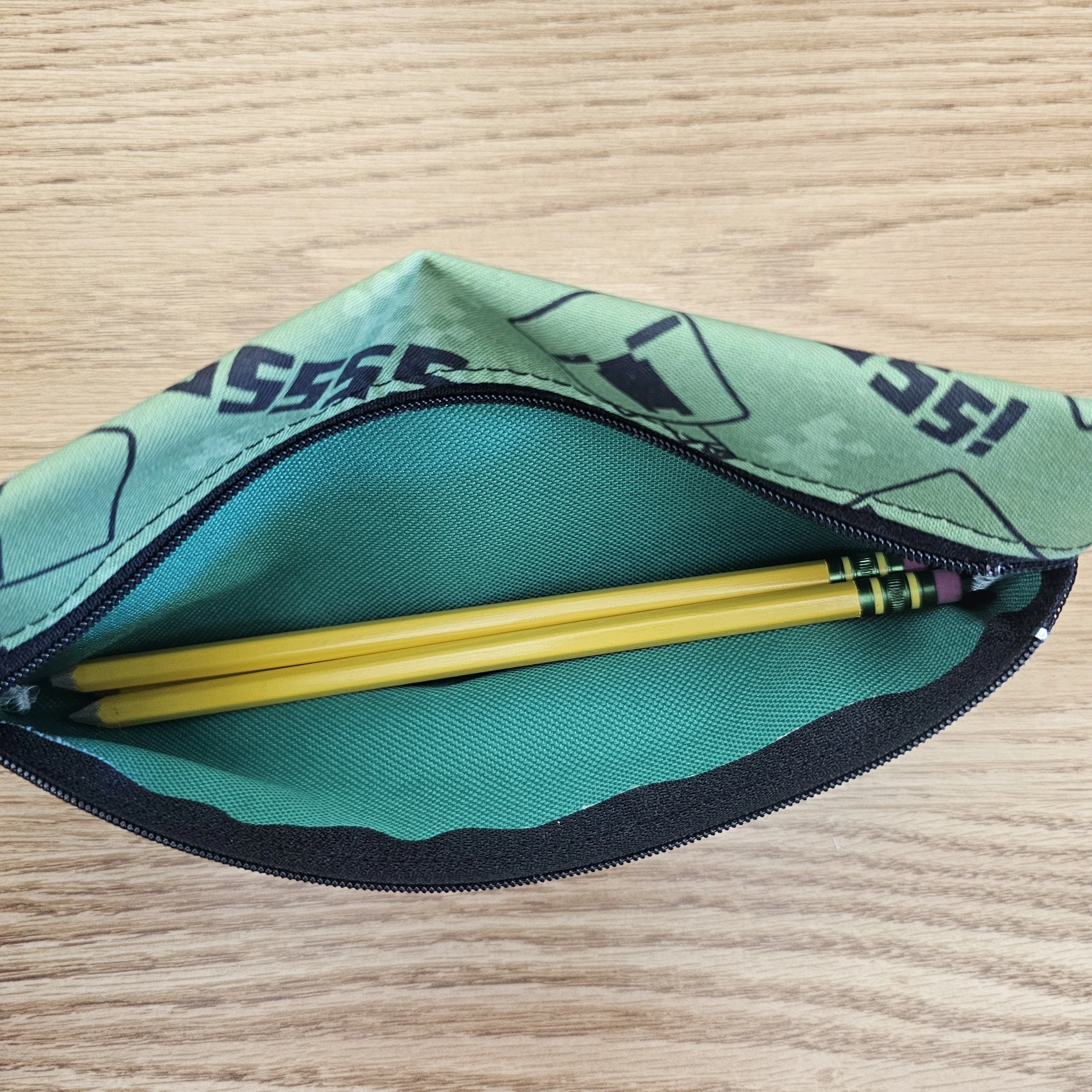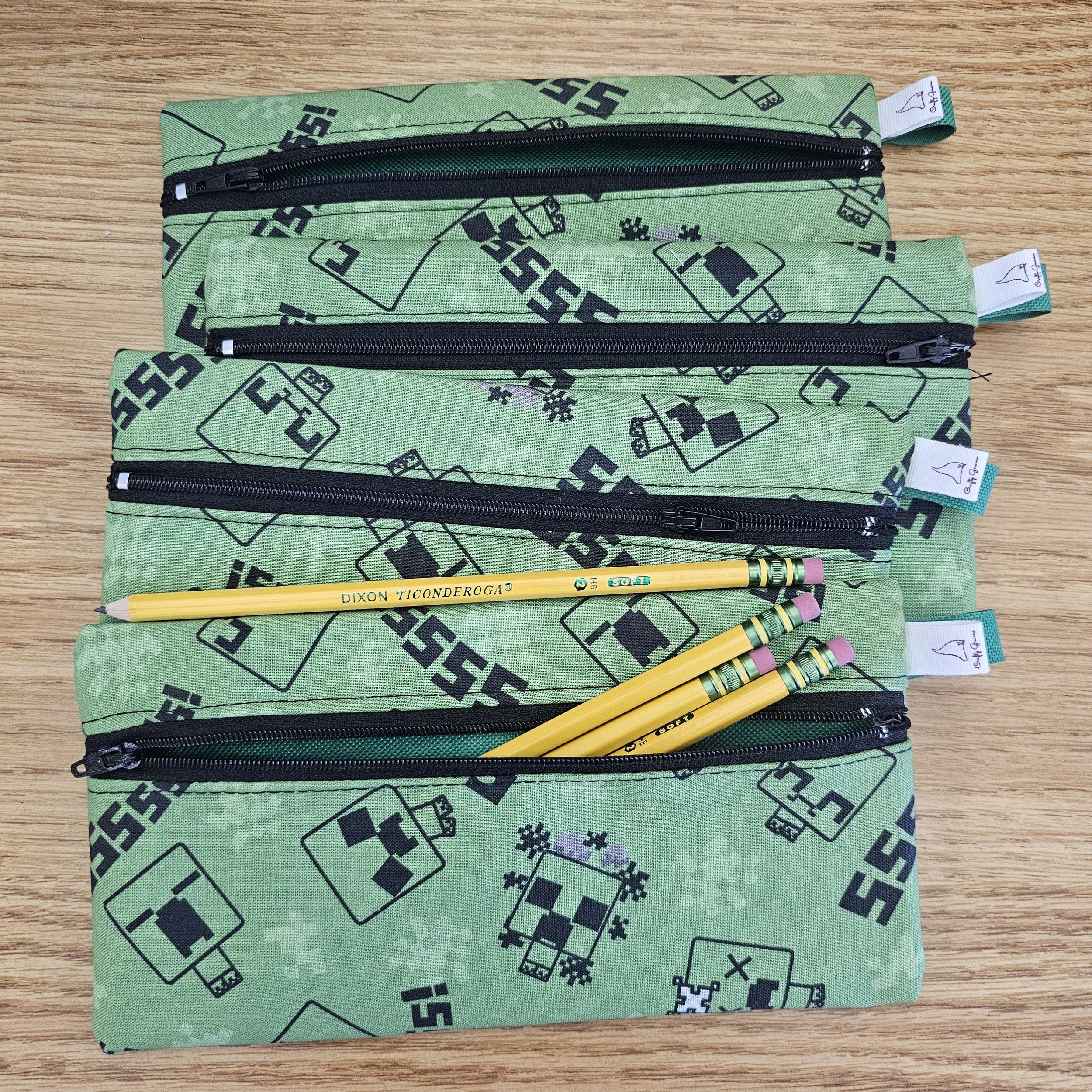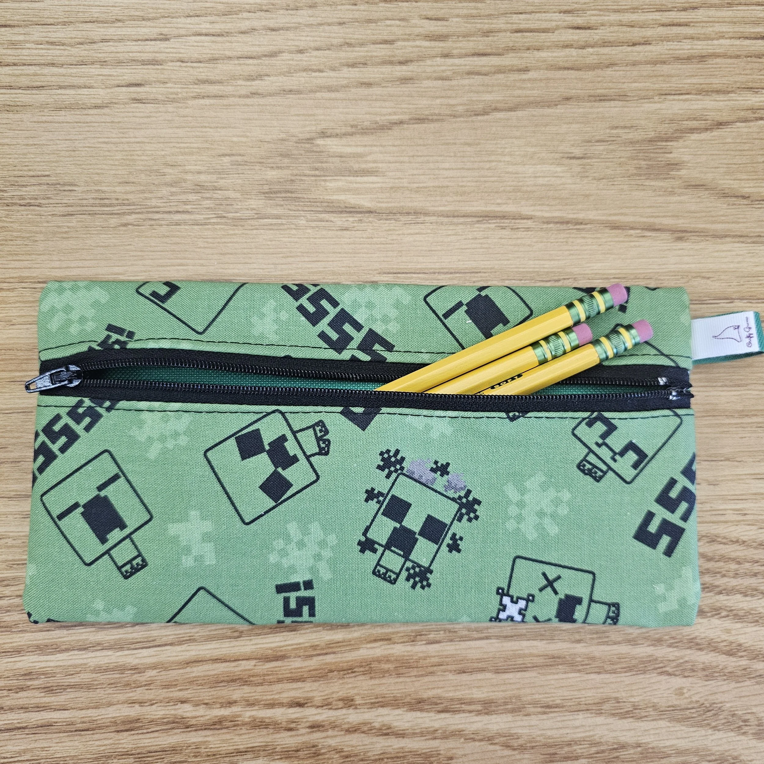 These simple pencil pouches are perfect for kids’ school supplies. The outer fabric is 100% cotton with a green crafting game pattern and the inside is a sturdy green waterproof canvas.
